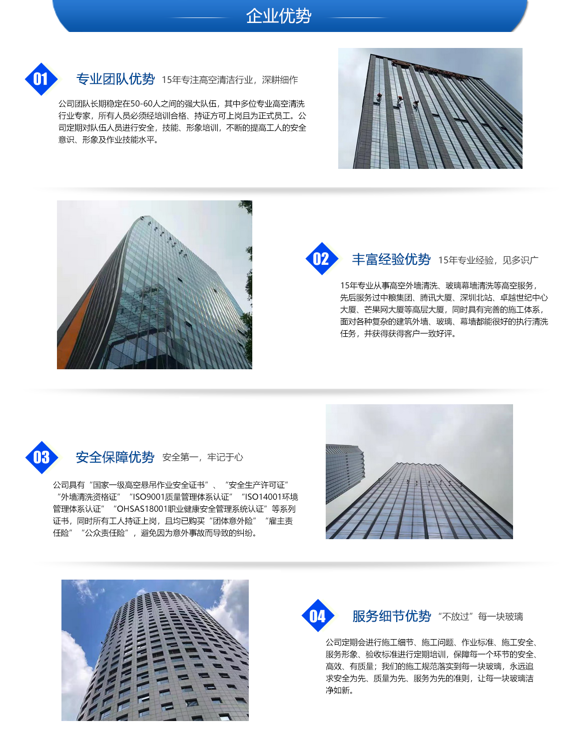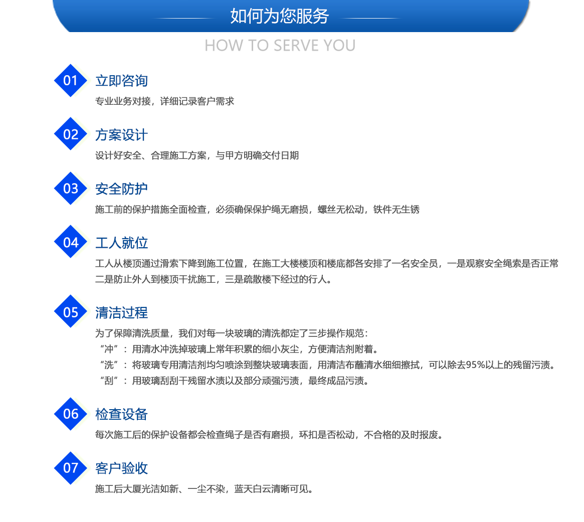 以客戶為中心,關注客戶需求,為客戶提供最好性價比的高空清潔服務。